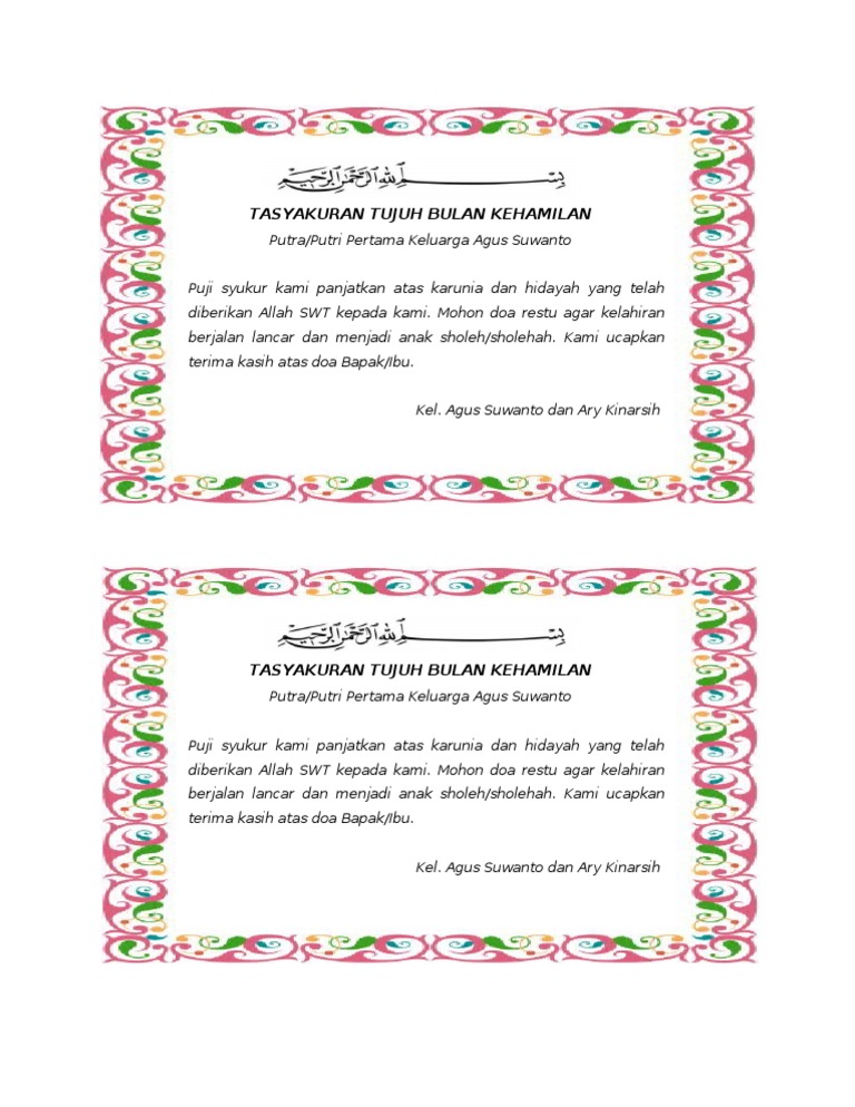 Download Kartu Ucapan Aqiqah Format Word Bisa Diedit Masudin Com from masudin.com Anda akan terkejut dengan hasilnya yang begitu luar biasa! Jual kartu ucapan syukuran 4 atau 7 bulan kehamilan. We did not find results for: Jual kartu syukuran utk 4 7 bulanan mitoni aqiqah souvenir. Contoh kartu ucapan aqiqah bayi pada berkat kotak nasi kartu kelahiran anak berkat. Contoh kartu ucapan aqiqah ba yi pada berkat kotak nasi 2015 terbaru. Dicari juga dengan kata kunci: Jual sticker 4 bulanan dengan harga rp100 dari toko online alit percetakan n adv pekalongan.